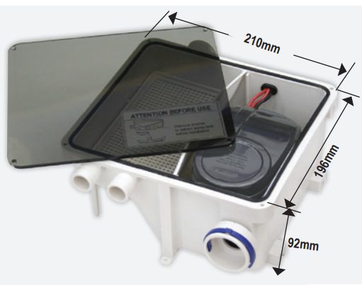 Designed especially for use on boats with built-in sink, shower or tub, the LSU 600 will pump all water out of the drain and into the tank. It is compact and can be mounted either against the floor or against the walls, in which case the two legs can be cut off. It has a built-in automatic bilge pump that will start operating as soon as the float switch senses water. Additionally, it features a filter, which can be easily serviced by removing the top transparent cover and a non-return valve at the outlet hose.